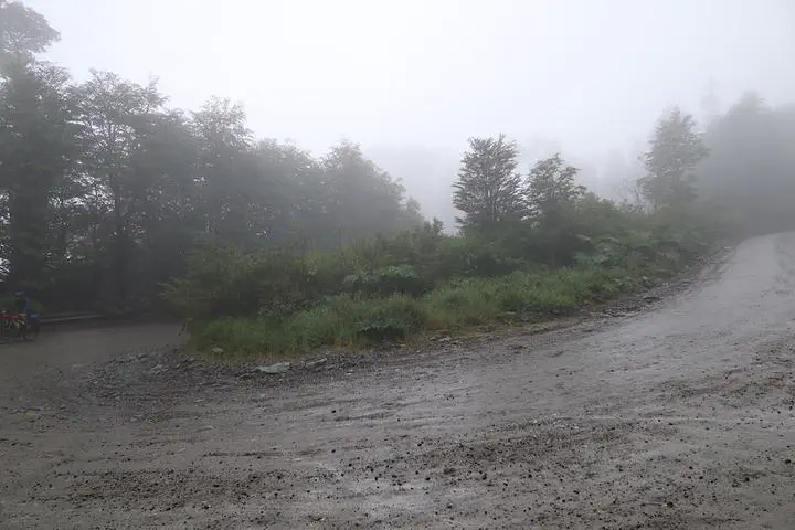 As I climbed up the pass, I also climbed into a cloud. By the top, the visibility was really low. Everything was wet, and of course there were streams of water running down the hill everywhere you looked.